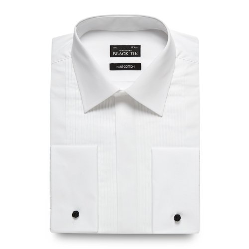 This white formal dress shirt from Black Tie has a pintuck pleated bib front with a semi cutaway collar. It gives a regular fit and is long sleeved with a double cuff. Also available in standard sizes. Also available in smaller sizes.