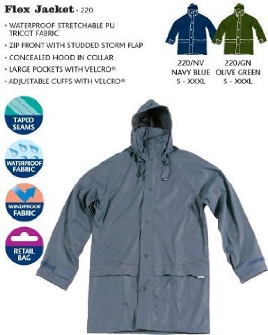 Mens fortress flex waterproof windproof stretchable jacket coat zip front with studded storm flap concealed hood in collar large pockets with velcro adjustable cuffs with velcro workwear taped seams compact lightweight branded quality work camping fishing rainwear trips car washing designed to keep the wet weather out navy & green s,m,l,xl,xxl,3xl