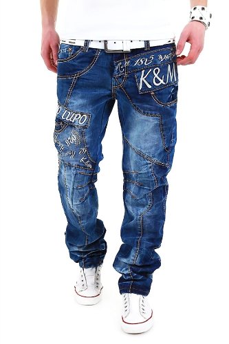 Brand: Kosmo Lupo Design: KM322 colour: Blue - faded Material: 100% cotton stylish jeans by Kosmo Lupo multi-pocket style, straight leg used look with fading hip contrasting-coloured thick seams cargo style Kosmo Lupo logo stitch saddle stitched seams Kosmo Lupo logo patch detailed workmanship materials and workmanship speak for themselves