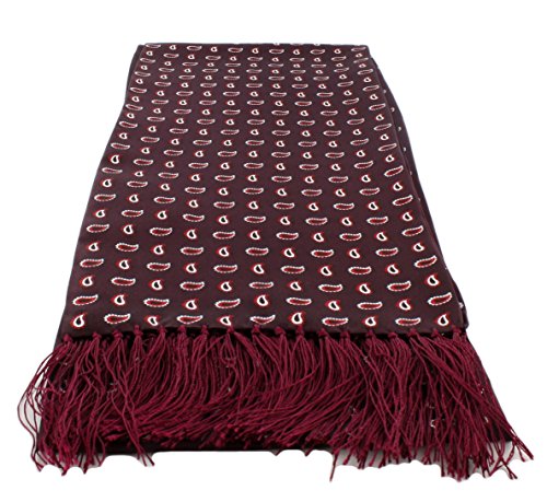 Silk narrow small pine scarf in burgundy 150cm long with 5cm hand knot tassels. 15cm wide. 100% Silk